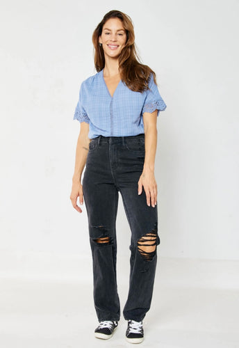 • Risen Mid Rise Front Seam Wide Leg Jeans