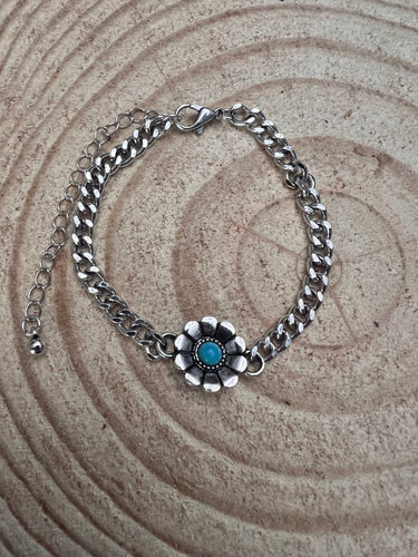 • Flower and Faux Turquoise Cuban Chain Bracelet