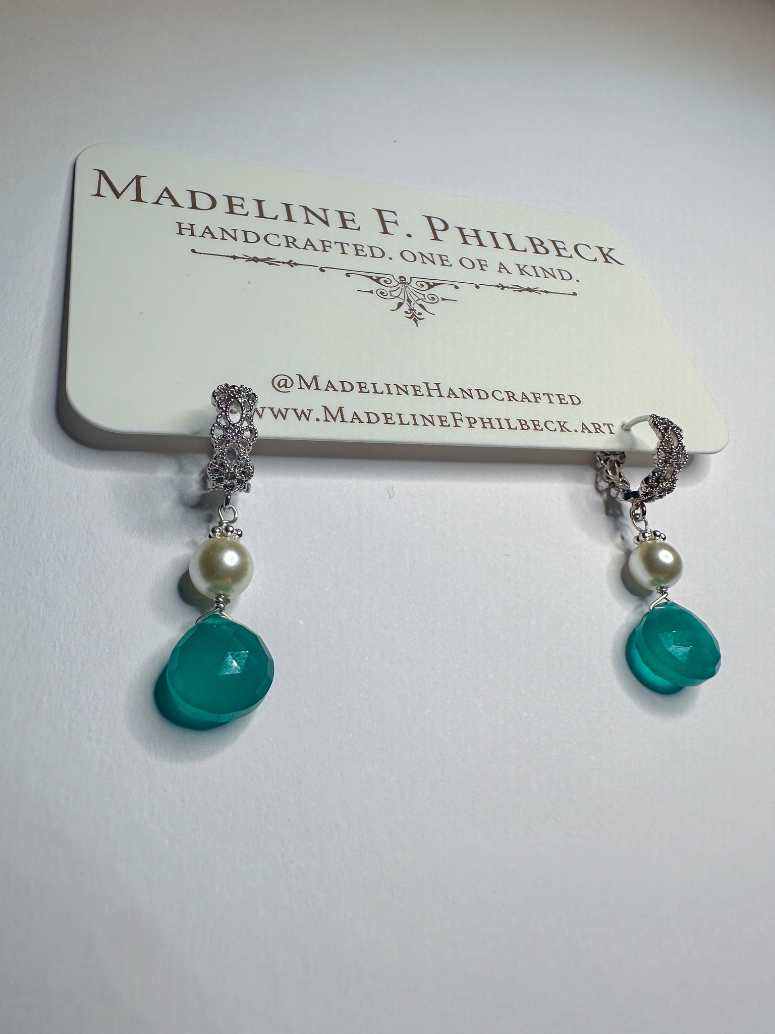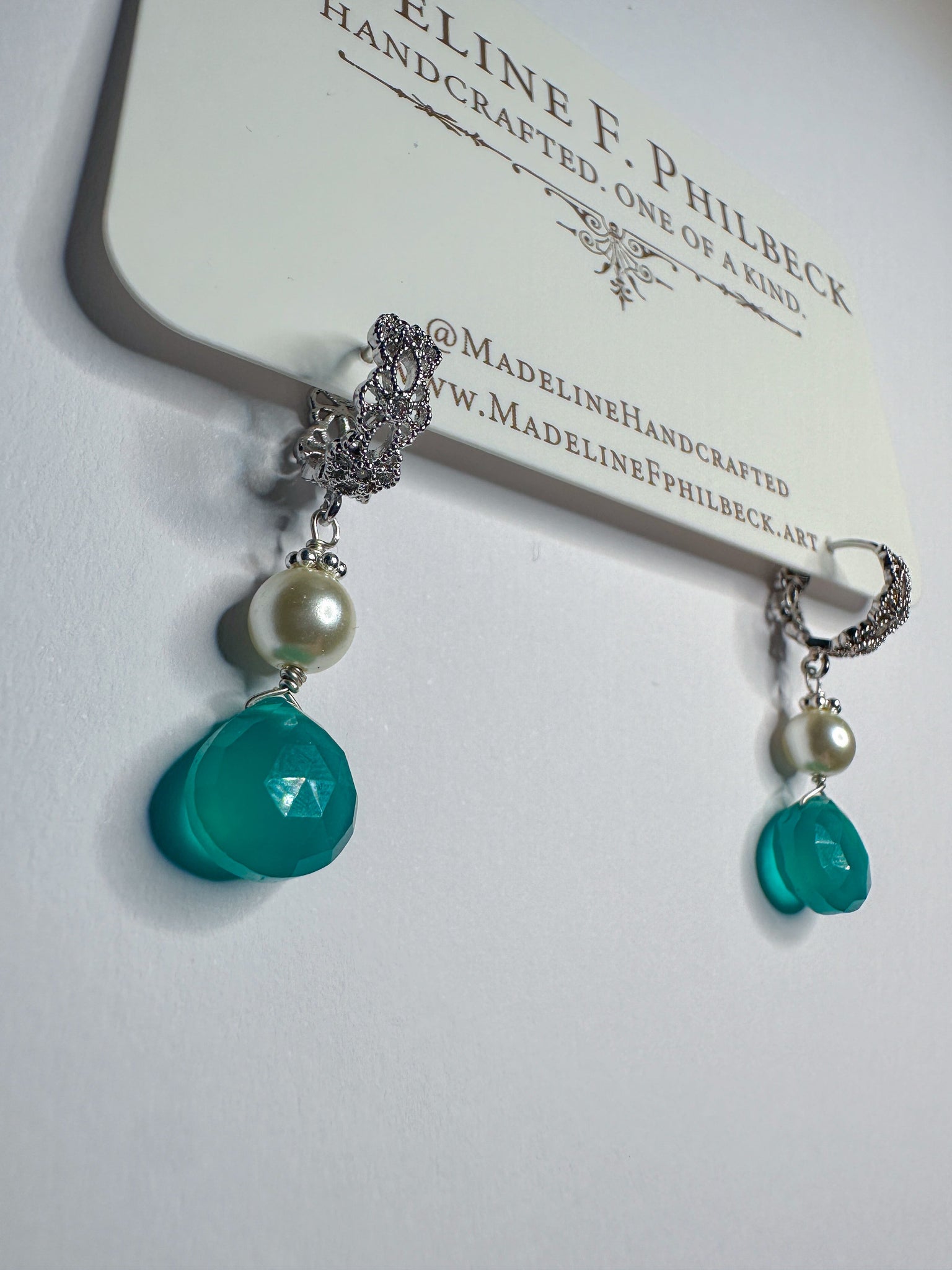 Teal chalcedony and ivory pearl on silver plated brass floral huggies