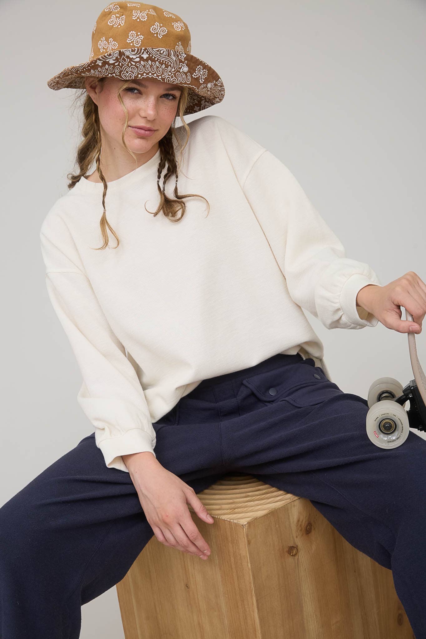This marled knit top features a round neckline and long sleeves with a relaxed drop shoulder design. Crafted from a soft blend of 53% cotton and 47% polyester, it offers a comfortable fit with raw edge detailing for a rugged, authentic look. Available in Brown or Oatmeal, this solid knit top is unlined, perfect for layering in true Western style.