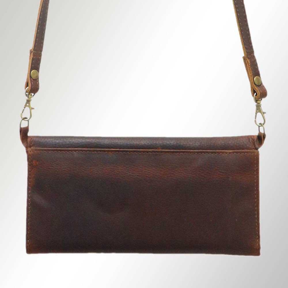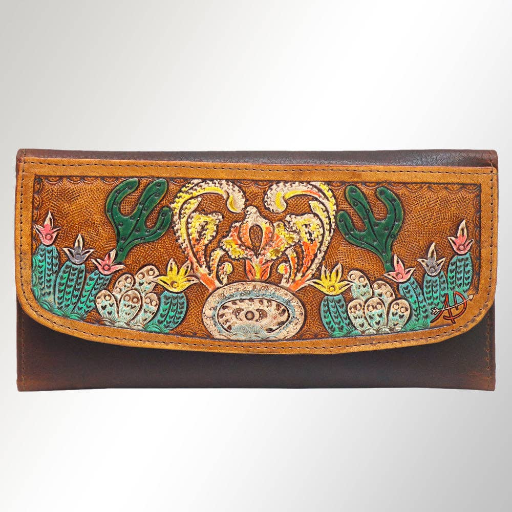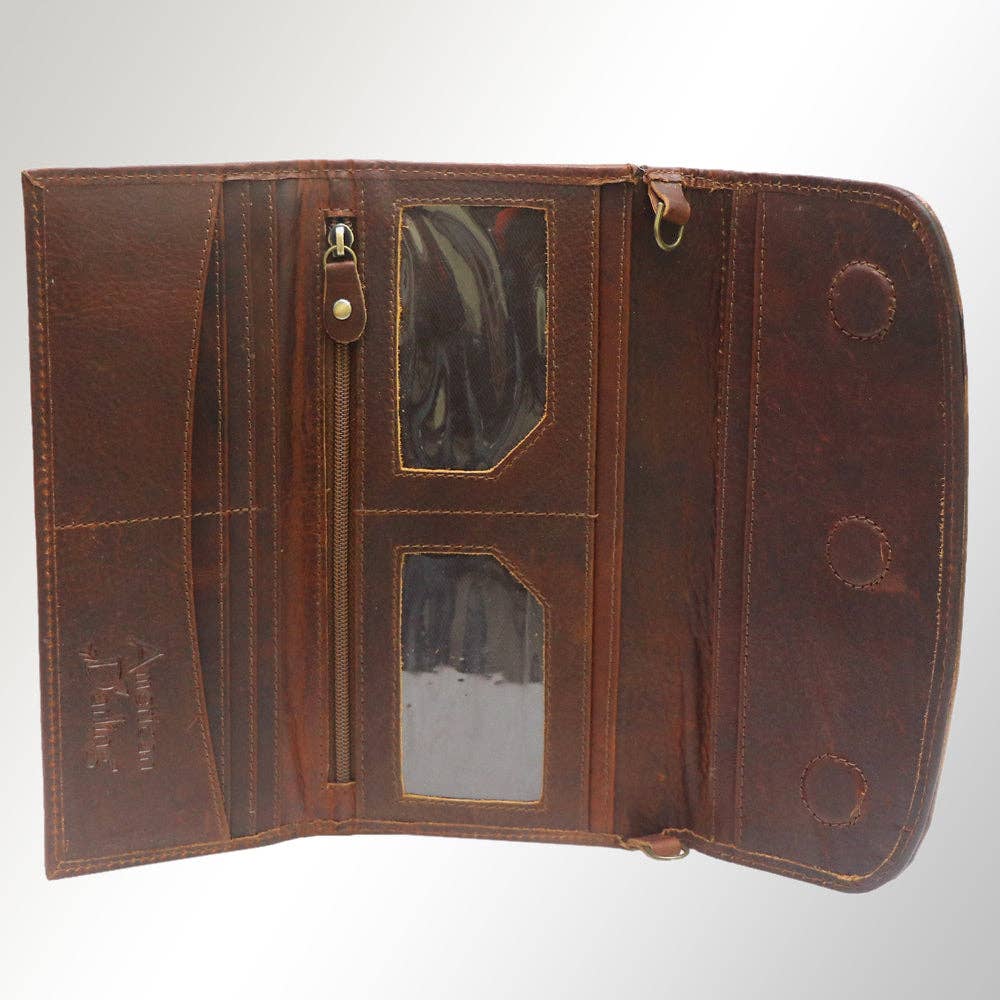 Made of high quality genuine top grain vegetable tanned American leather. The leather is hand tooled, carved and finally antiqued. This soft and supple leather ages beautifully as it wears. Created by the finest artists and craftsmen in the country.  Genuine YKK brand zippers are known being long lasting and durable. The magnetic closure keeps everything safe. Use as a wallet or a small bag.