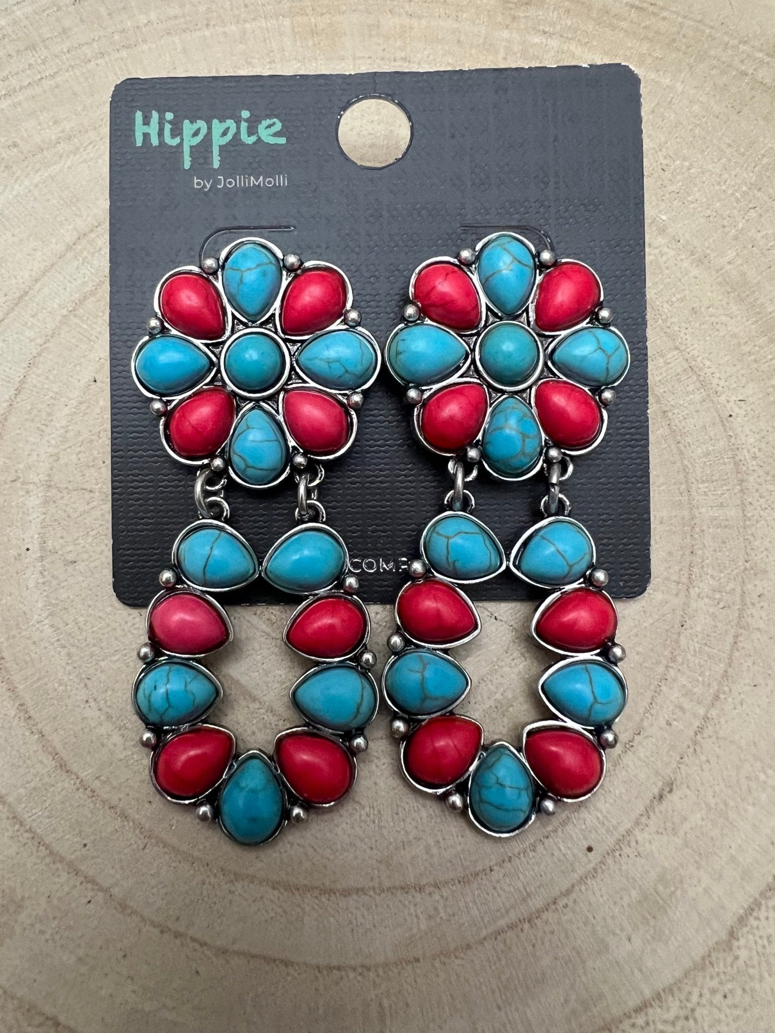 These Faux Turquoise and Coral Cluster Post Earrings capture the spirit of the West with their vibrant colors and intricate design. Featuring a cluster of faux turquoise and coral stones, these earrings bring a bold yet authentic look to any outfit.