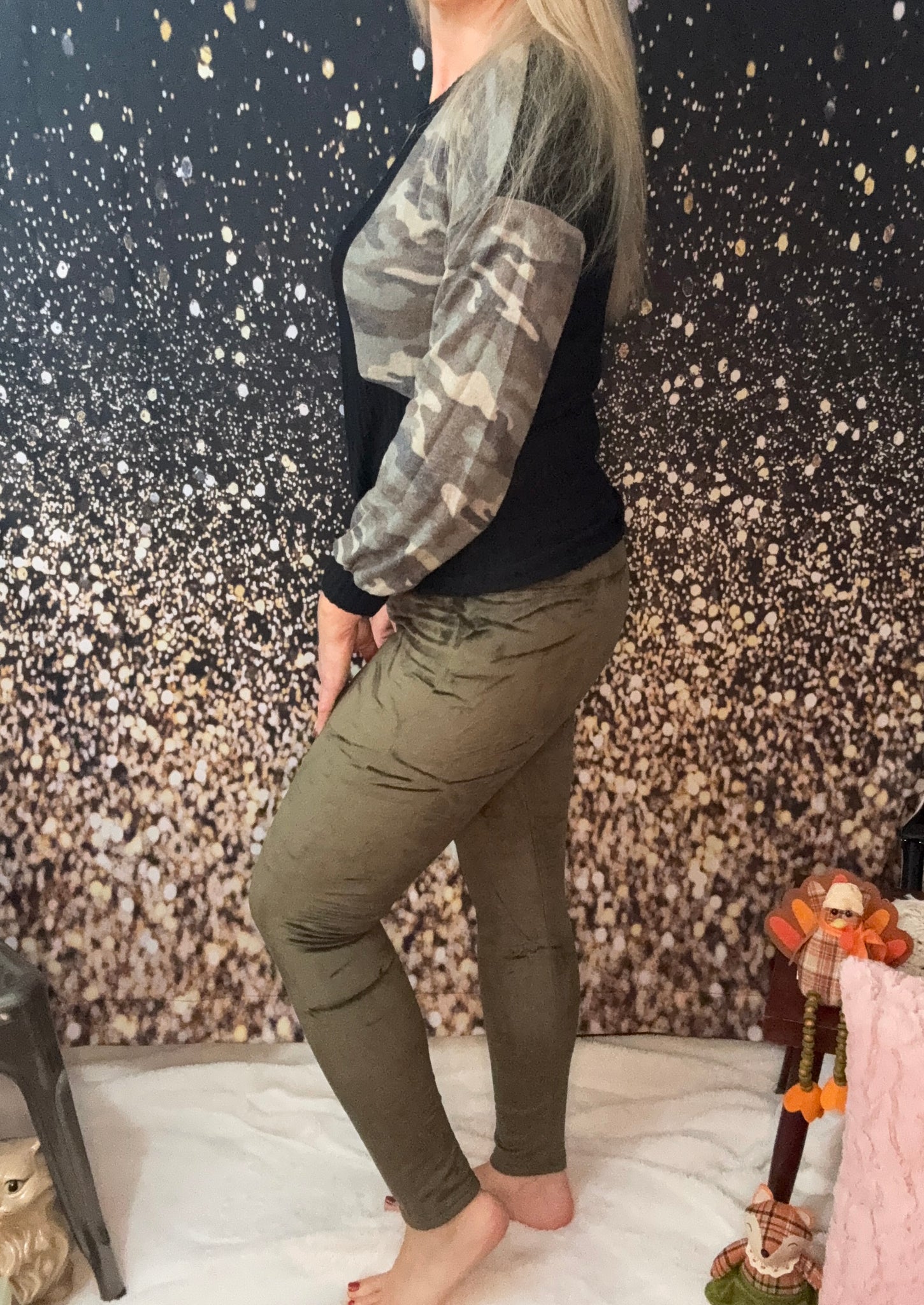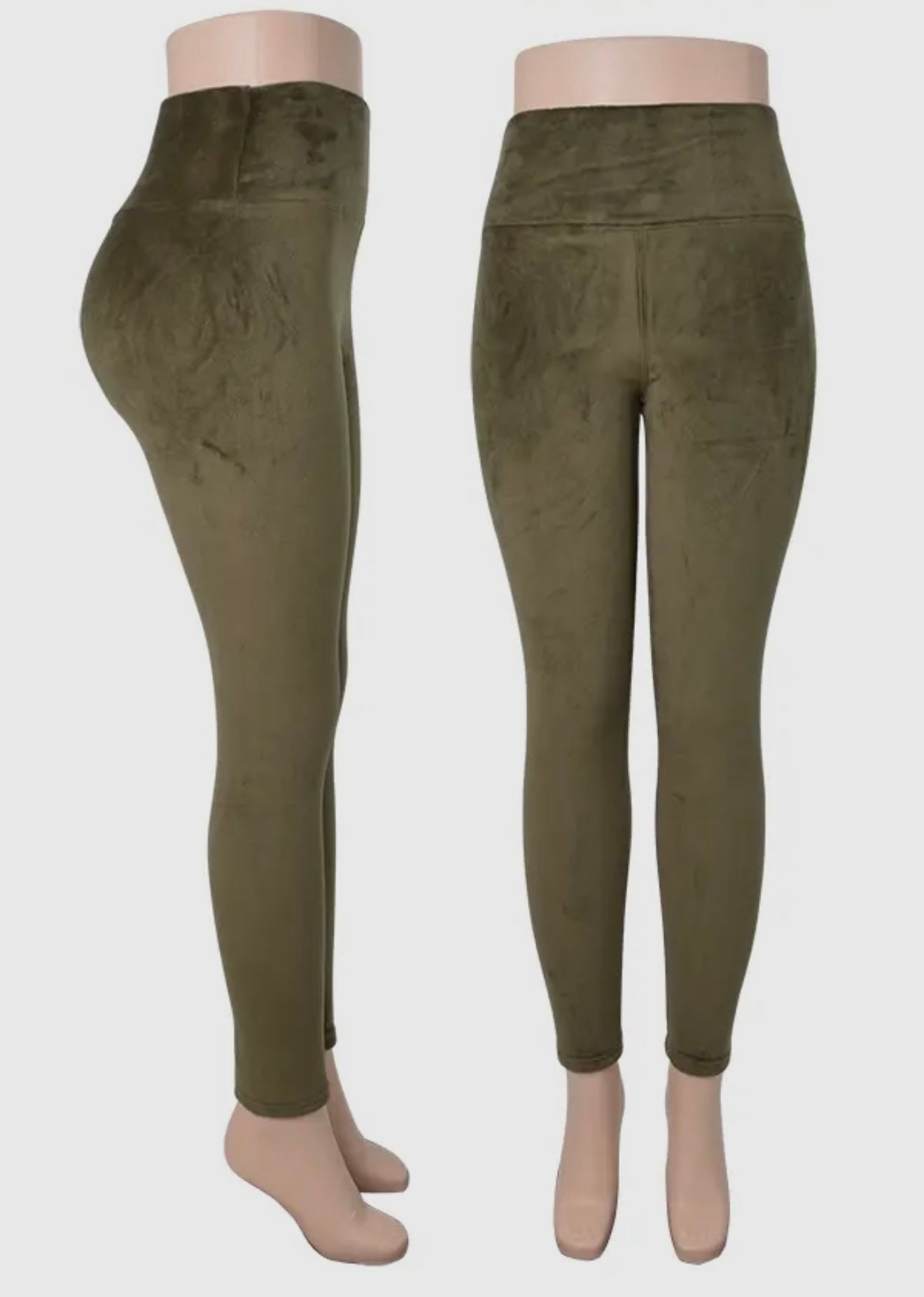 Olive Green Velvet Leggings With Elastic Waist.